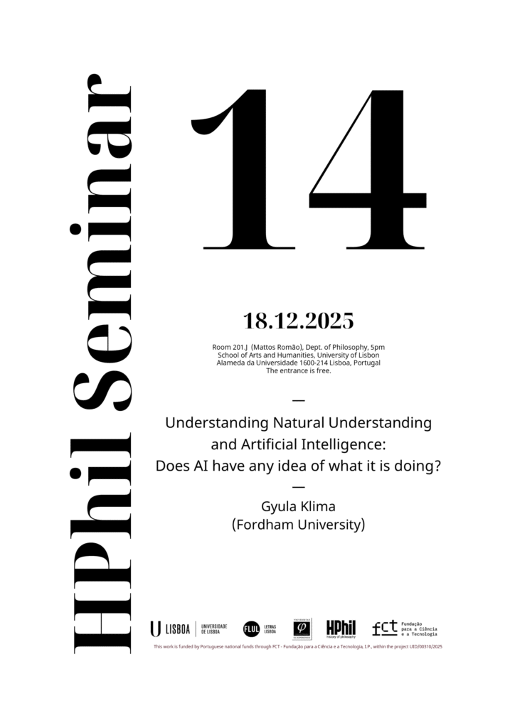 The HPhil (History of Philosophy) Research Group of the Centre of Philosophy of the University of Lisbon announces the 2025/26 edition of its permanent seminar on the history of philosophy, devoted to the presentation of conferences by renowned specialists while also creating opportunities to emerging scholars, aiming to promote advanced studies in groundbreaking debates and the permanent training of its academic community.