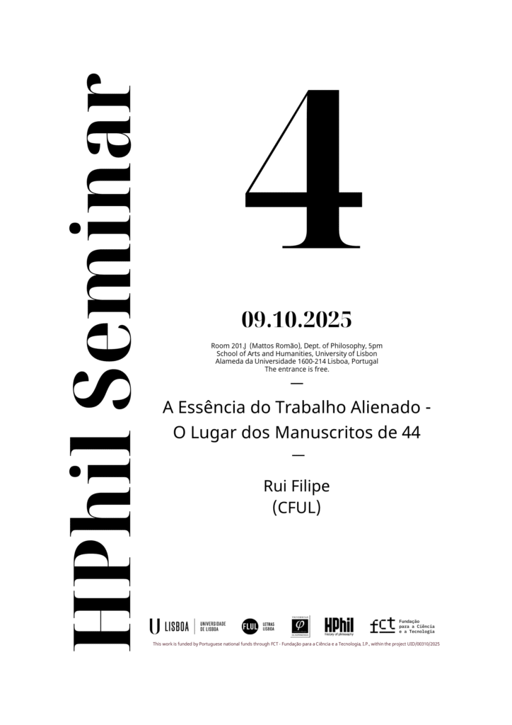 In this session of the seminar, Rui Filipe (CFUL) will present a work of his, entitled “A Essência do Trabalho Alienado – O Lugar dos Manuscritos de 44”. (abstract below)